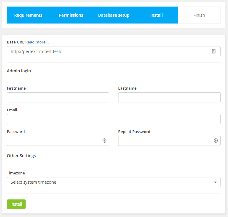 Assume that you uploaded the files to “crm” folder, navigate to eq. http://yourdomain.com/crm/install – Keep in mind that you need to adjust the URL based on where you uploaded the files. If you are installing on subdomain named eq crm you need to access the url like http://crm.yourdomain.com/install.